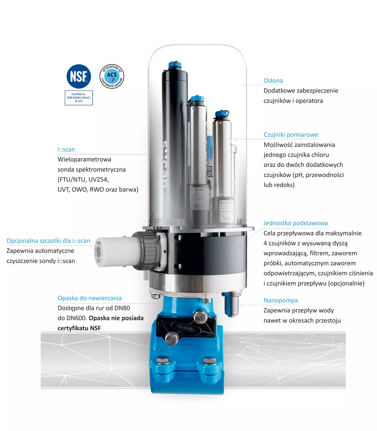 Pipe::scan to system złożony z maksymalnie 4 czujników do monitorowania jakości wody pitnej w sieci dystrybucyjnej pod ciśnieniem. Mierzy do 10 parametrów w jednym urządzeniu: OWO, DOC, UV254, mętność, kolor, chlor, pH/redoks, przewodność, temperaturę i ciśnienie. Wykorzystywana metoda oparta o wielopunktowe rozmieszczenie systemów pipe::scans to idealne rozwiązanie do monitorowania wody pitnej w dowolnym punkcie sieci.