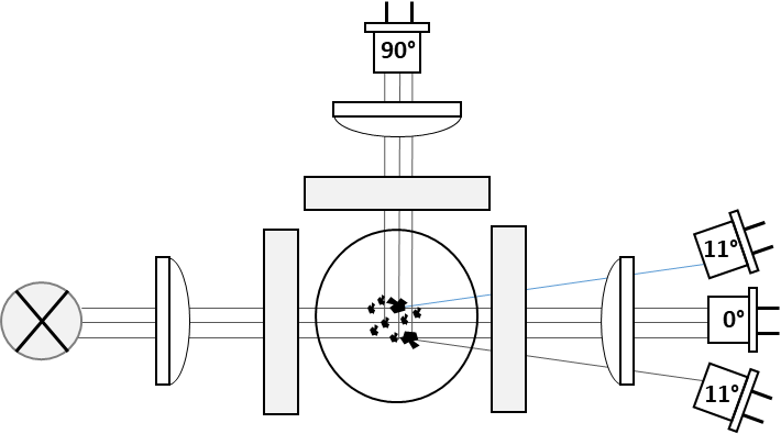 Przy nieco większych wielkościach cząstek świetnie sprawdza się pomiar przy niższych kątach, który mierzy rozpraszanie do przodu. Teoretycznie najwyższy stosunek sygnału do tła lub najwyższa czułość uzyskuje się przy pomiarze jak najbliżej 0°. Ze względu na ograniczenia techniczne wynikające z konieczności oddzielenia sygnału rozproszenia od sygnału transmisyjnego wiązki wzbudzającej, najmniejszy kąt, jaki można zrealizować, wynosi 11° Pod niższymi kątami detektory rozpraszające po prostu wykrywałyby bezpośrednie światło z wiązki wzbudzenia.