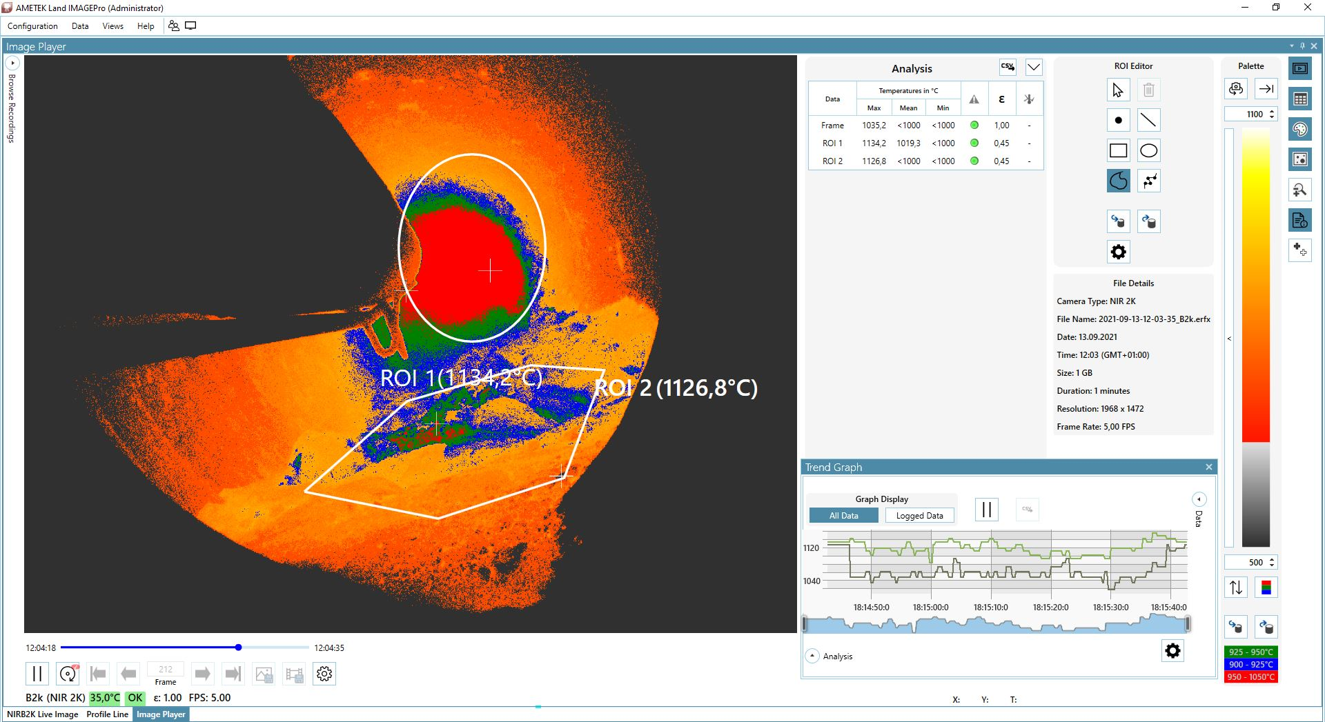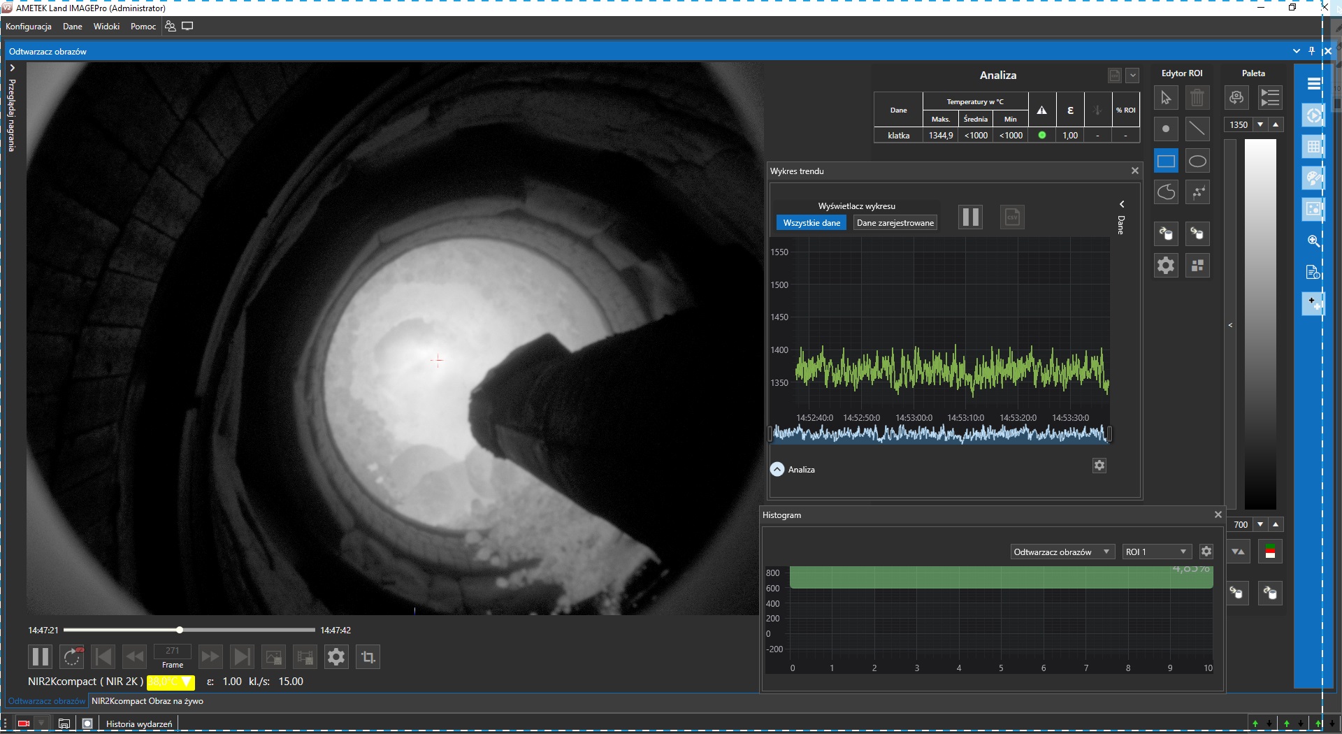 Stacjonarna kamera termowizyjna do pomiaru i analizy temperatury płomienia, klinkieru, stanu materiałów ogniotrwałych, monitoringu wielkości granulacji klinkieru (zbrylanie), do analizy termicznej pieca cementowego, wapiennego, keramzytowego (lub inne do odzysku materiałów np. ołowiu, metali szlachetnych).