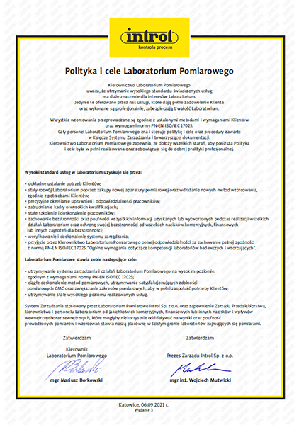 Akredytowane Świadectwa Wzorcowania wystawiane w laboratorium wzorcującym firmy Introl są uznawane przez wszystkich audytorów, ekspertów technicznych zarówno w kraju jak i za granicą.